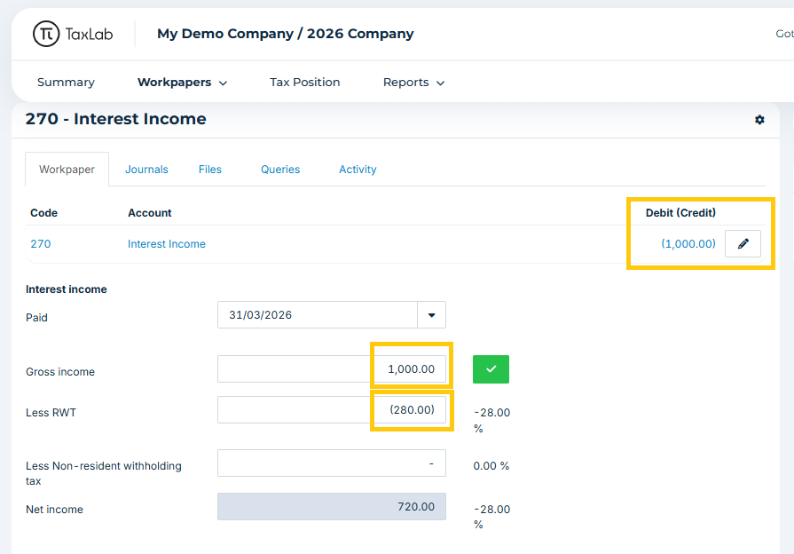 Workpapers can either be added to a trial balance account, or directly to an entity. The adjustments in the workpapers apply throughout the tax calculation. Users can review these in the income tax position, where the applied adjustments will be displayed.