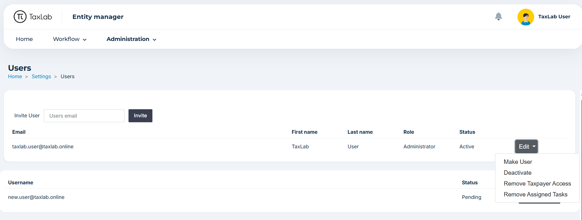 - From the TaxLab home screen, in the navigation bar select Administration > Users