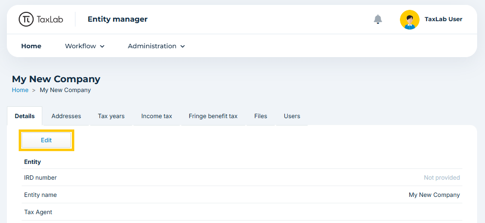 When a new entity is created in Taxlab, only minimal information is required to be entered. Some details are automatically populated by defaults, which need to be checked. These details can be edited at the entity level, and also at the tax year level. Every time you add a new entity it is best practice to check and confirm all details at both the entity and income tax levels before adding a subscription.