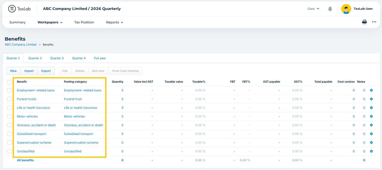 In TaxLab, benefits provided to employees are organised using pooling categories and benefit categories.