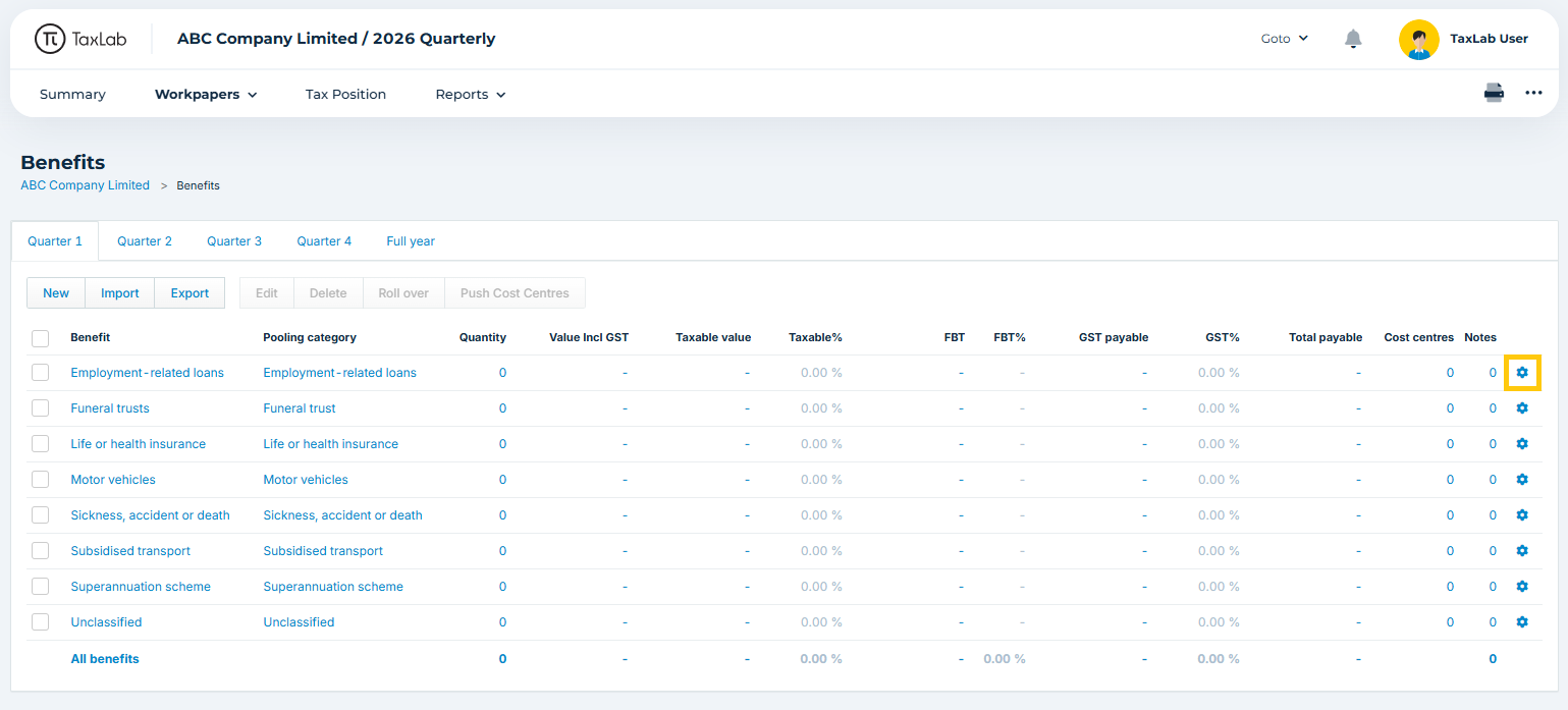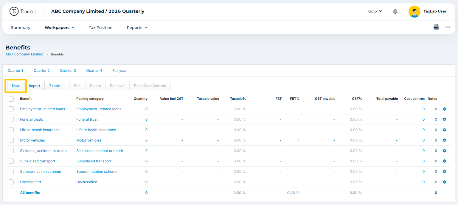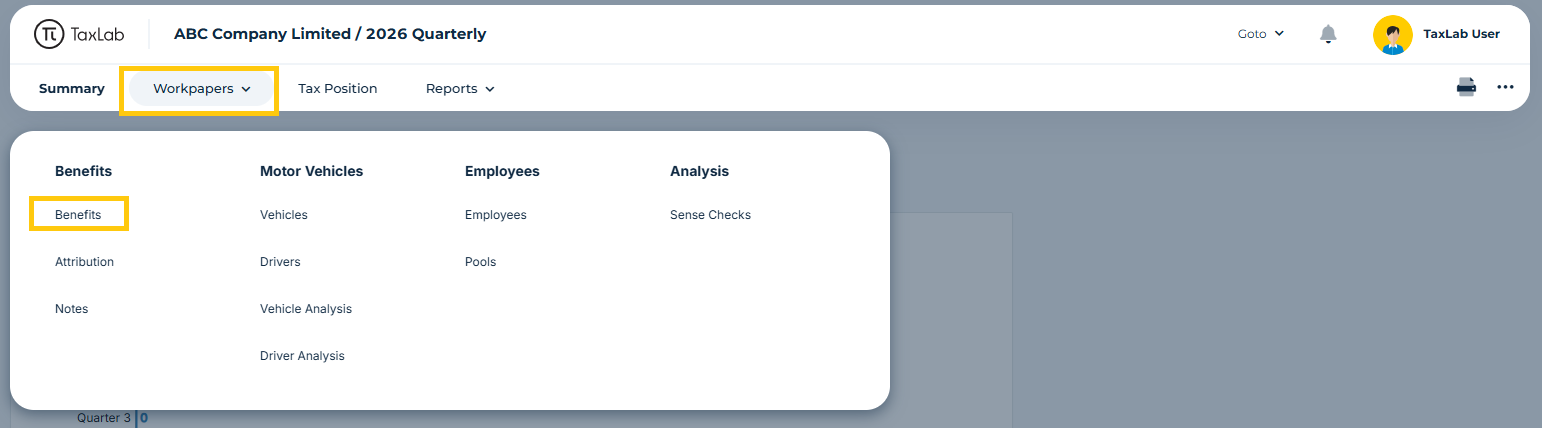 - From the entity's FBT return, in the navigation bar select Workpapers > Benefits.