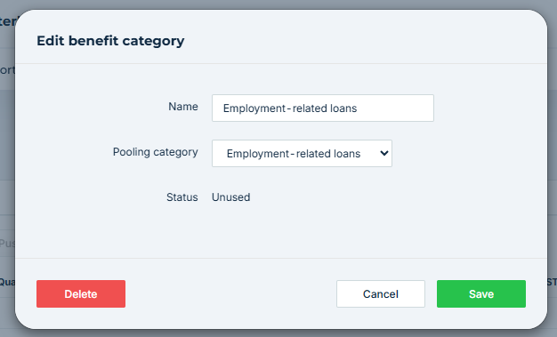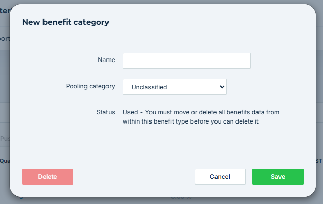 A benefit category can only be deleted if there are no benefits associated with it in any locked period across any tax year. This helps prevent accidental deletion of data from prior periods.