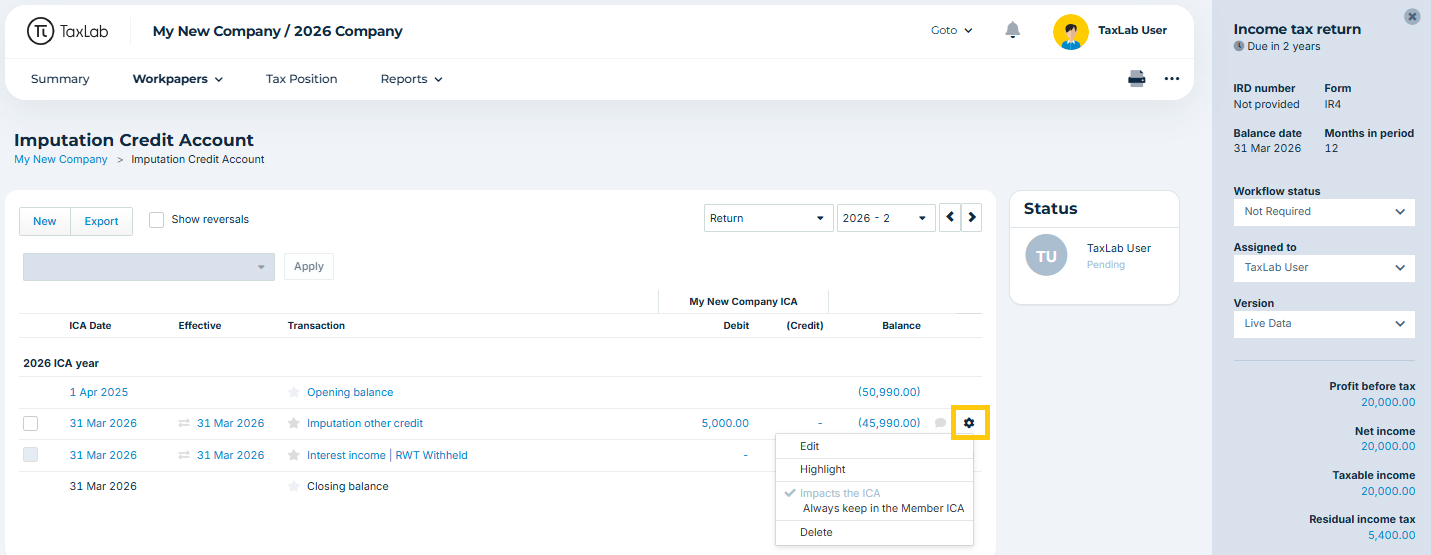 The Imputation Credit Account (ICA) workpaper is automatically populated using data from other workpapers in TaxLab, as well as transactions from Inland Revenue integrations. Additional transactions can be added manually to the ICA. The workpaper keeps a running balance of the ICA and flows directly into the IR4J annual imputation return.