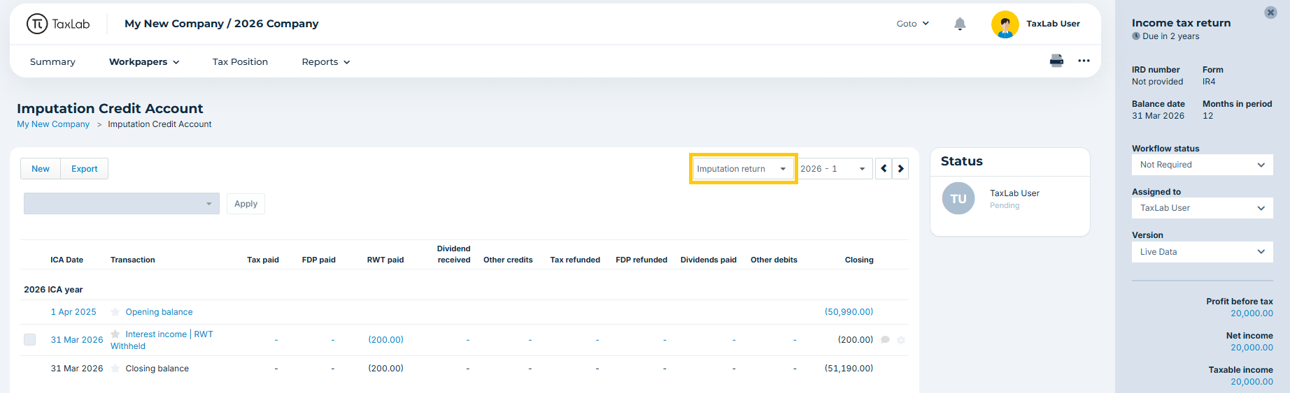 - From the entity's tax year summary, in the navigation bar select Workpapers > Imputation Credit Account.