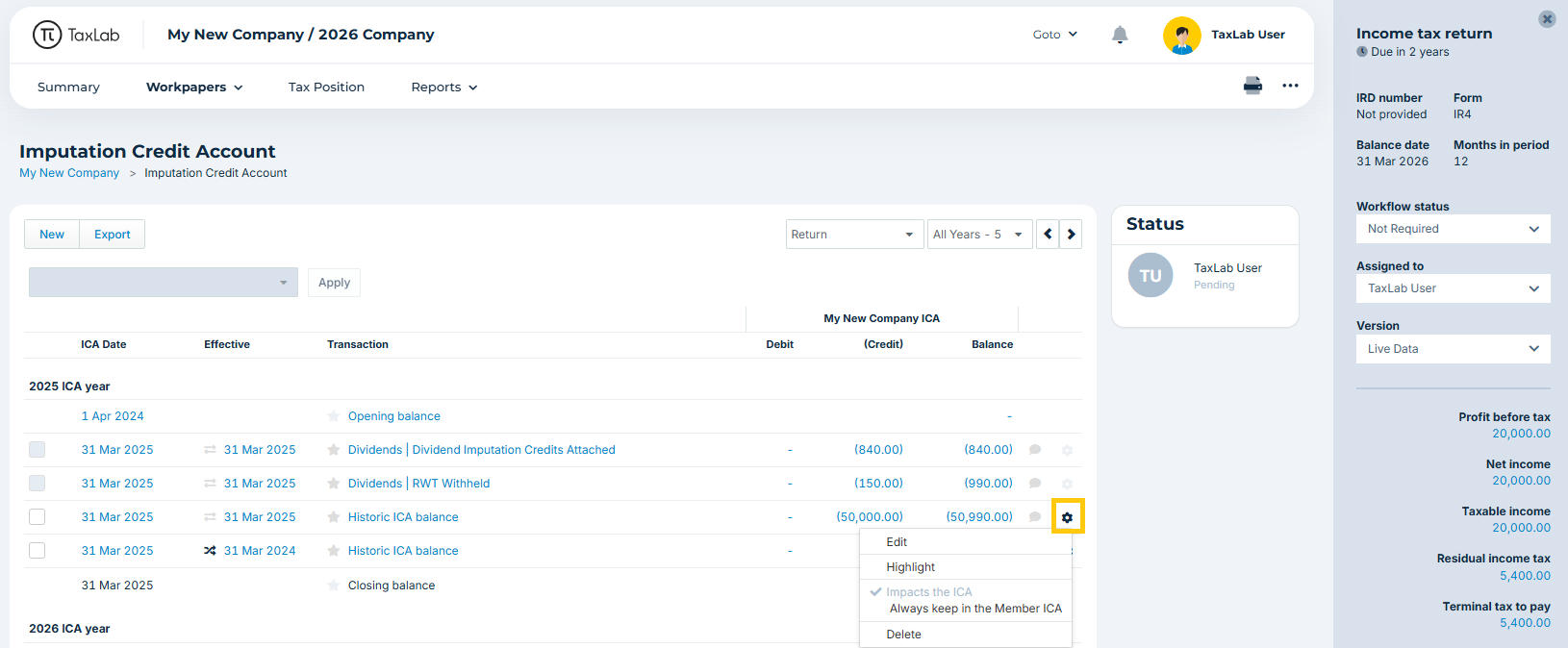 The Imputation Credit Account (ICA) workpaper is automatically populated using data from other workpapers in TaxLab, as well as transactions from Inland Revenue integrations. Additional transactions can be added manually to the ICA. The workpaper keeps a running balance of the ICA and flows directly into the IR4J annual imputation return.