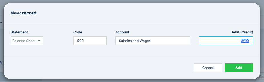 - In the Statement dropdown, select where to add the account. Enter the Account Code, Account name, and a Debit or (Credit) balance. Select Add.