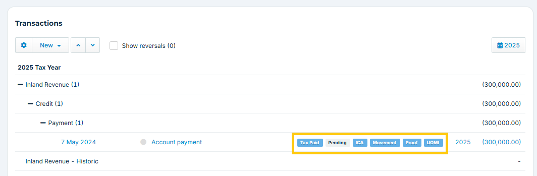 - Show reversals (when ticked) displays debits and credits of any reversing transactions from the Inland Revenue integration, that net to 0. Any change made to a reversing transaction (such as ticking it as tax paid) will have the same effect on the other side of the reversal. Any reversals where both sides are not on the same date and cross tax years will always both display by default.