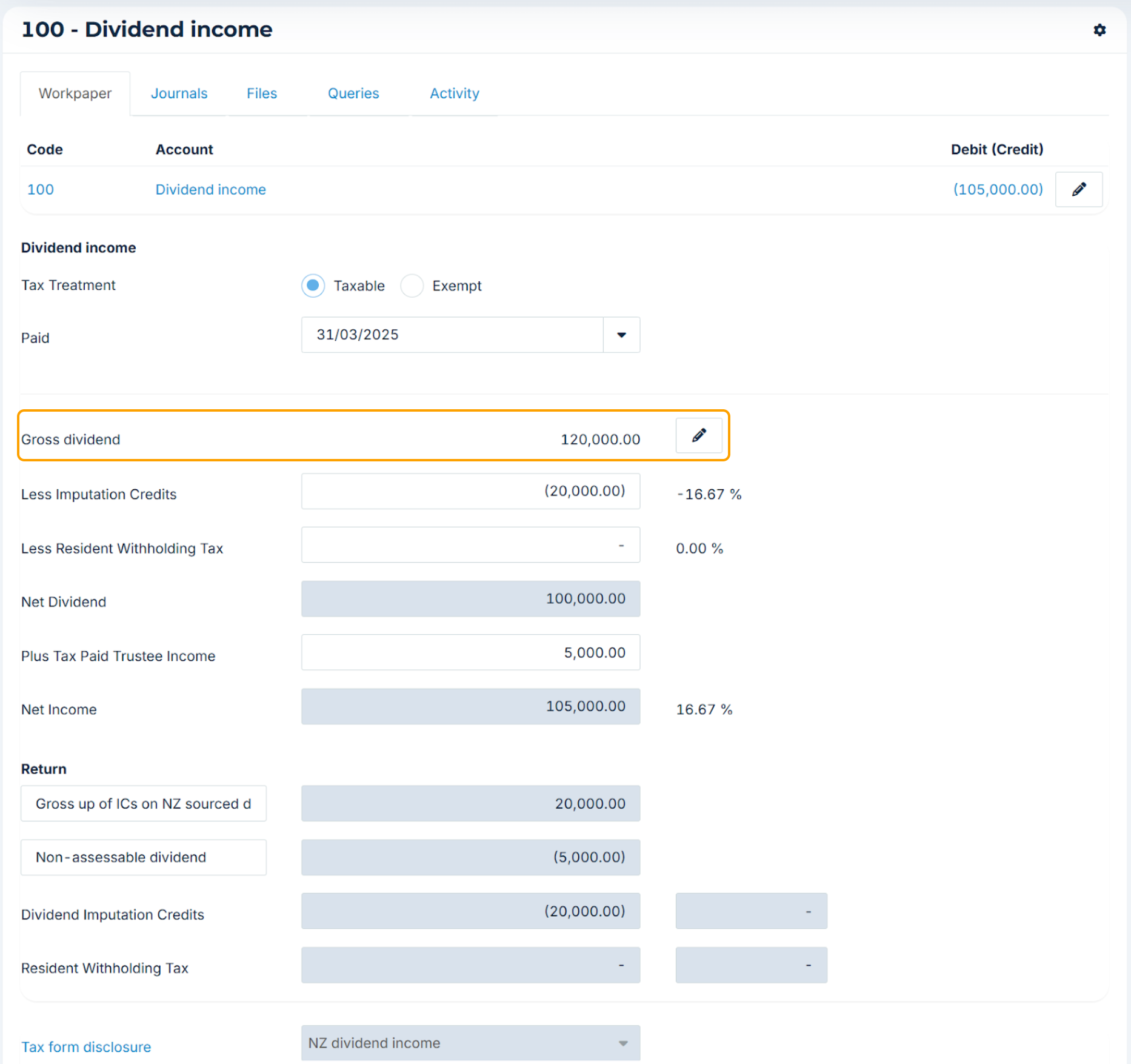 Gross dividend: Enter the gross amount of the dividend including imputation credits and resident withholding tax (RWT). If the dividend income in your trial balance is net of RWT and/or Imputation Credits it will need to be grossed up to include these, by selecting the pencil icon and editing the gross dividend amount.